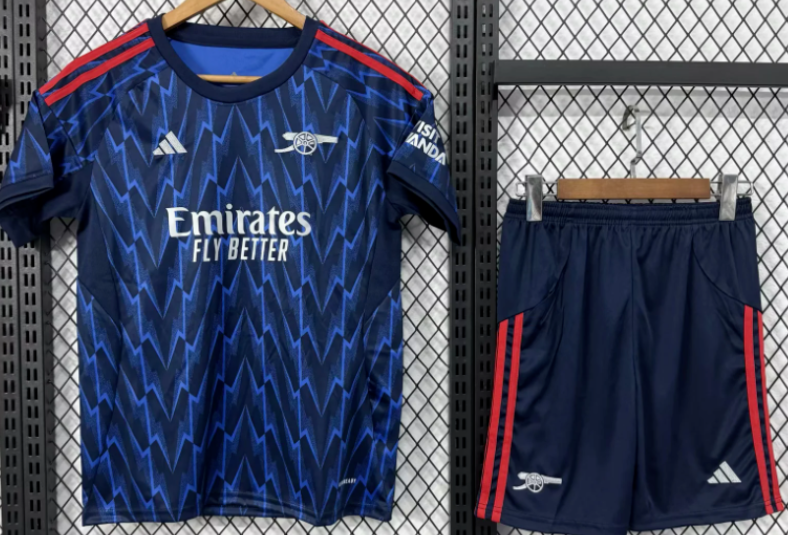 Kids Arsenal 25/26 Away Kit The Kids Arsenal 25/26 away kit features a dark navy blue base with a royal blue lightning bolt graphic pattern. The shirt includes red Adidas three stripes on the shoulders, a light silver Adidas logo, Emirates sponsor branding, and the Arsenal cannon crest. The collar is a navy blue crew…