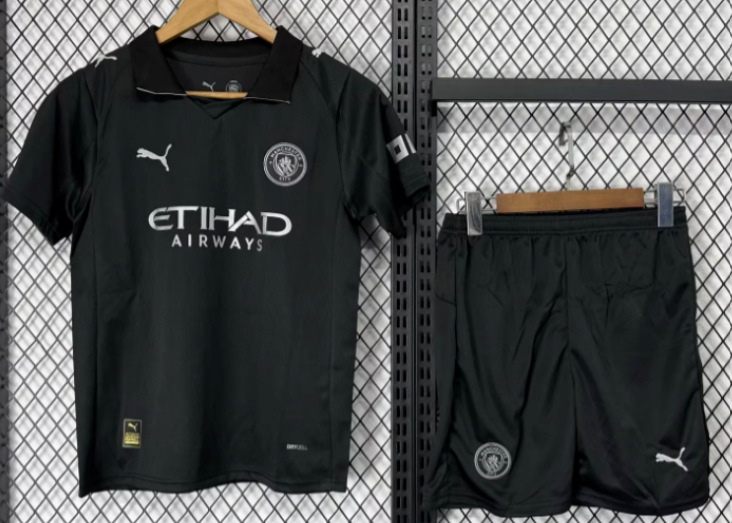 The new Kids Man City 25/26 Away Kit has a simple design with black as the main colour and metallic silver logos. Rounding off the stylish look of the Kids Man City 25/26 away kit is a classic polo collar with silver trim. The last time Manchester City used black for their kit was in the 2023-24 season, but the new kit is much more understated and classy.