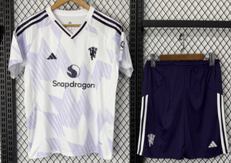 Kids Man United 25/26 Away Kit The Kids Man United 25/26 away kit features a white and light lavender colour scheme with dark purple accents, drawing inspiration from the ‘snowflake’ design of the 90-92 away kit. Adidas incorporated an overlapping v-collar and the devil logo on the kit, diverging from the full Manchester United crest.   The Kids…
