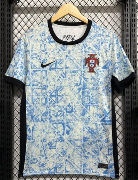 The Portugal Euro 2024 away shirt boasts a design closely connected to Portugal’s history. The kit features an all-over graphic with an Azulejo-style pattern that has a grungy effect to it.