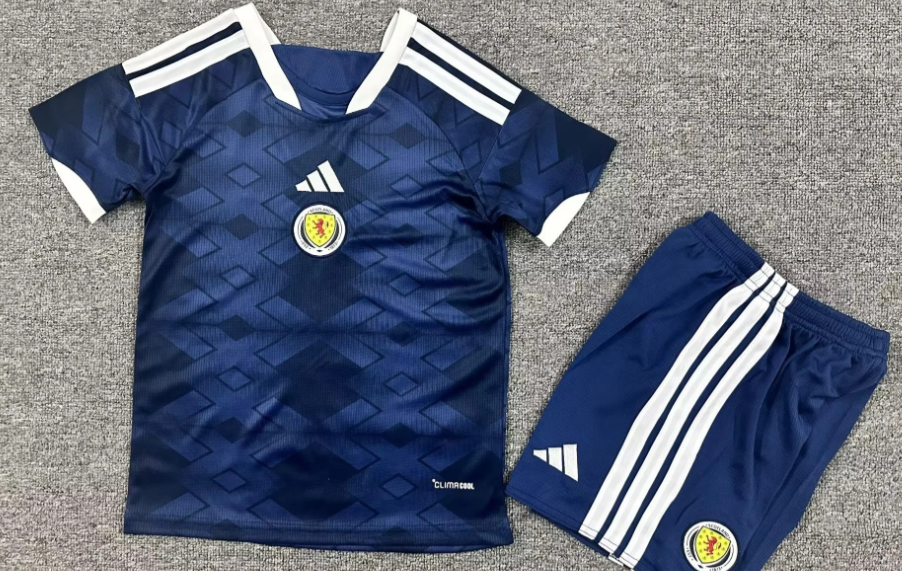 The Kids Scotland 2026 home jersey stays true to tradition with a dark navy base featuring a subtle tonal pattern across the chest.