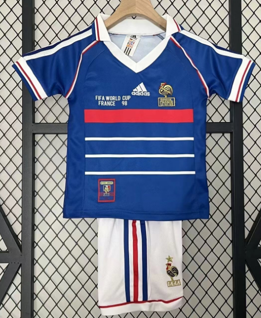 This is a brand new and unworn Kids Zidane France 1998 Retro Kit that the French national team wore during the 1998 World Cup tournament held in France.
